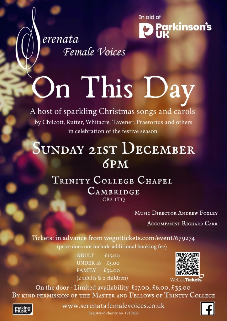 « All Events Christmas Concert in Trinity College Chapel December 21 @ 6:00 pm - 7:30 pm « Holt Church Christmas Concert Click here to buy tickets for Cambridge Concert Add to calendar Google Calendar iCalendar Outlook 365 Outlook Live Details Date: December 21 Time: 6:00 pm - 7:30 pm Venue Trinity College Chapel Trinity College Cambridge, CB2 1TQ United Kingdom + Google Map